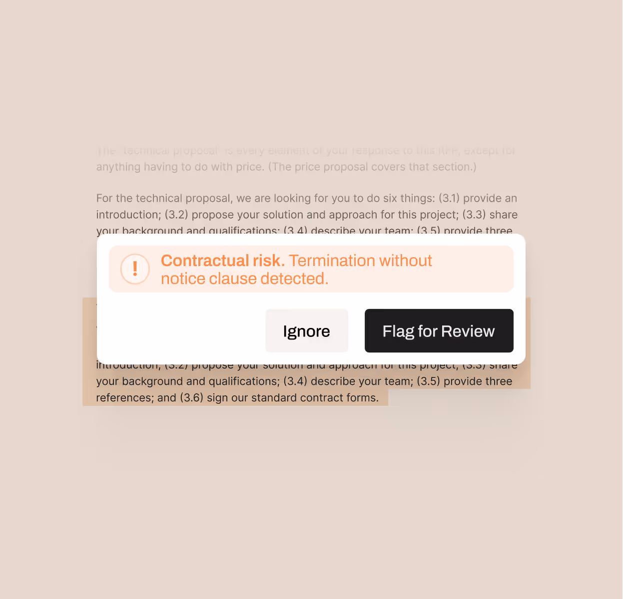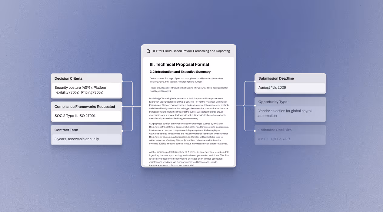 Anchor extracts key insights from complex RFPs—highlighting risks, surfacing red flags, and helping you qualify opportunities instantly. Focus your time on the deals that matter, not reading through pages of documentation.